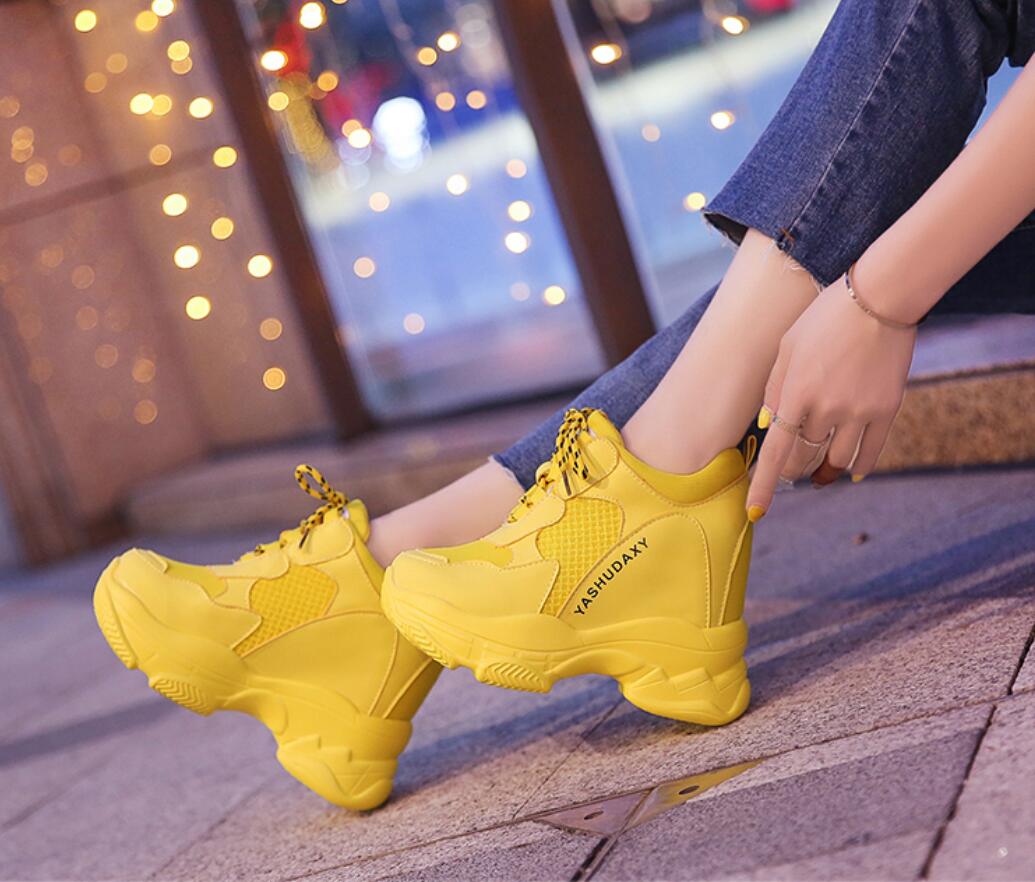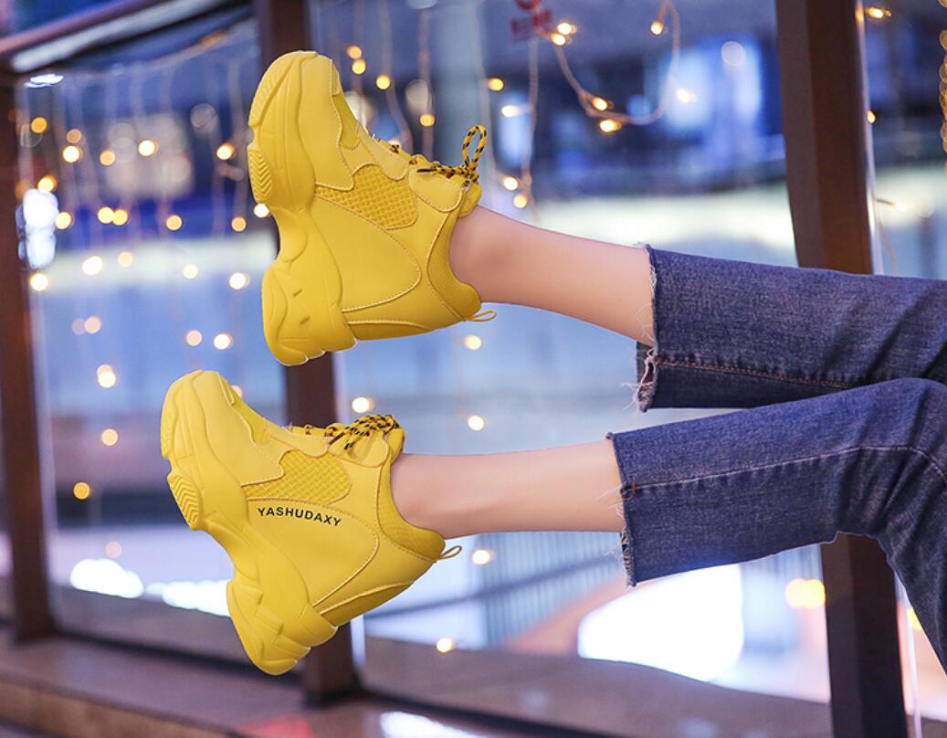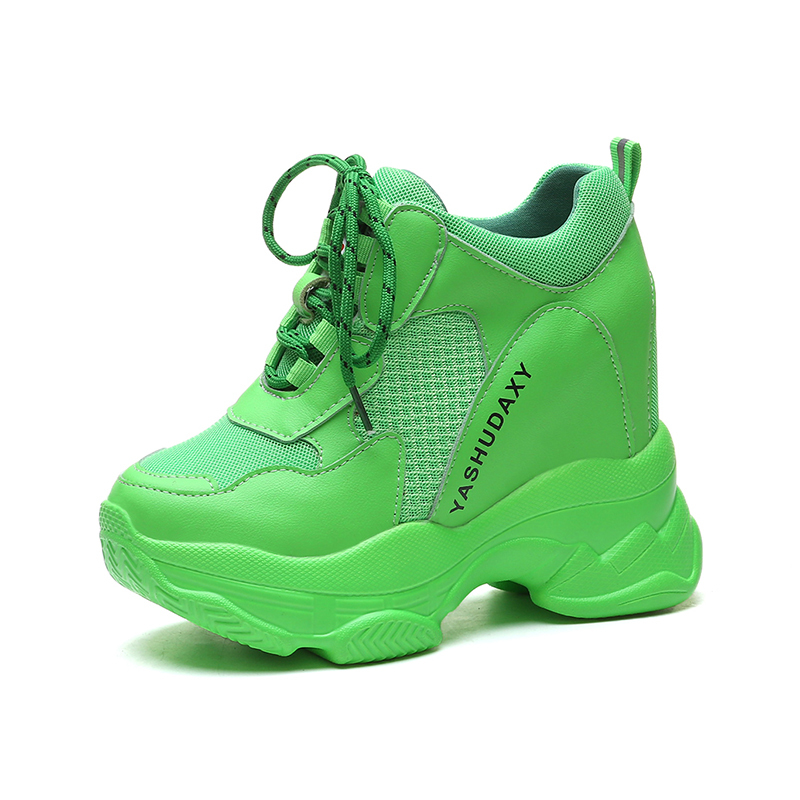 这款老爹鞋采用了外部7cm的厚底,以及4cm的内增高,让你瞬间增高11cm,可能你会怕跟太高穿起来不方便,因为后跟非常稳健,所以脚感和一般的增高鞋是差不多的,稍加适应后穿起来是不会有太大负担的,配合防滑耐磨的鞋底,打造惬意舒适的穿着体验。 2019夏款透气网面10cm内增高厚底女士运动鞋ins潮绿色松糕老爹鞋