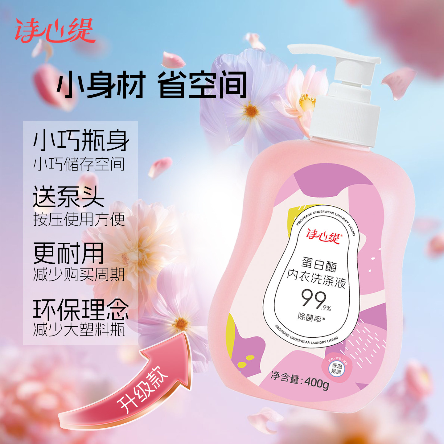 诗心缇内衣洗衣液400g2瓶!送泵头~添加蛋白酶酵素的内衣洗衣液!淡淡的清新香气,去味净味!添加阴离子表面活性剂,离子渗入!针对各类分泌物、残留物、血渍、尿渍靶向清洁!轻松去渍搓洗不费力,低泡易漂衣净无忧