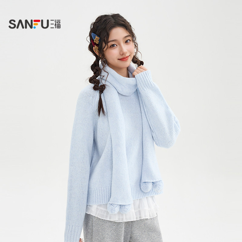 三福毛衣冬季女2025新款毛球围巾圆领宽松时尚休闲上衣女装513495
