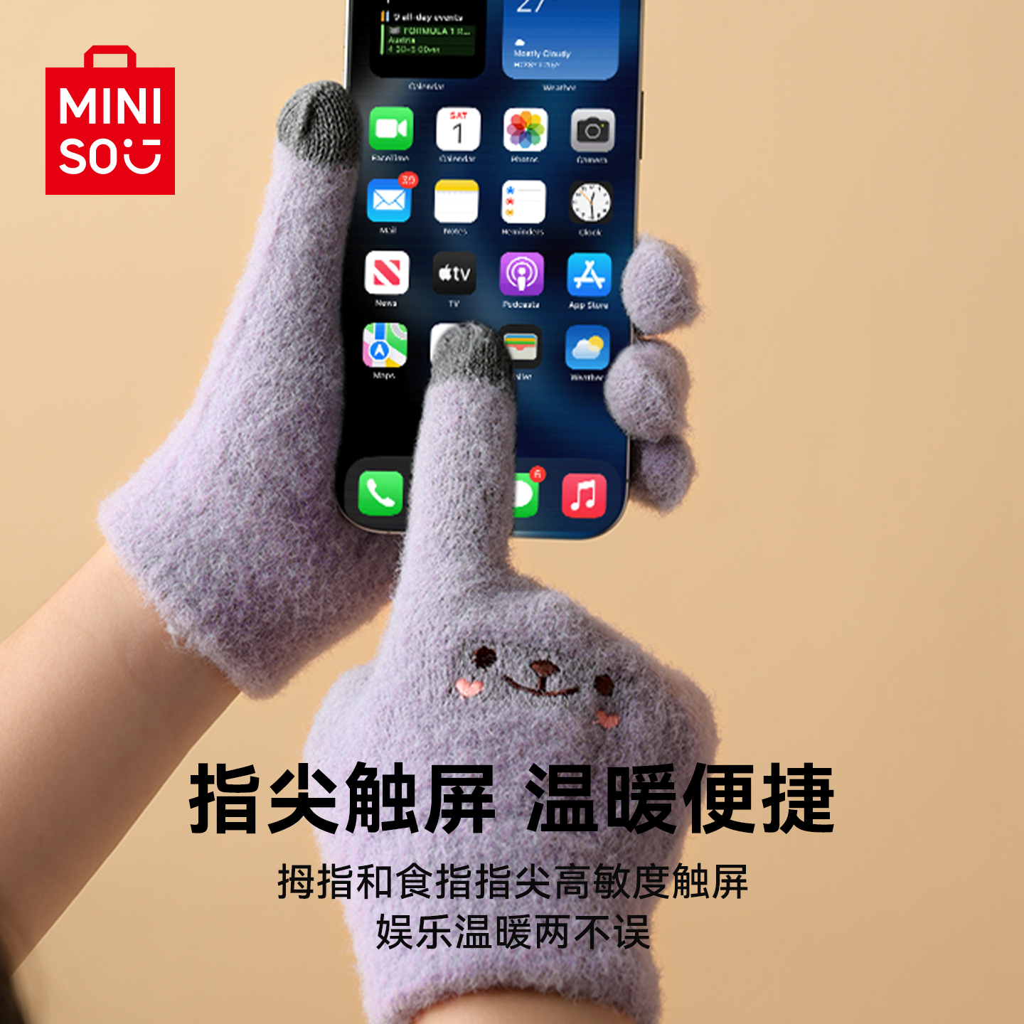 miniso名创优品冬季手套女保暖加绒针织触屏手套学生通勤户外防冻