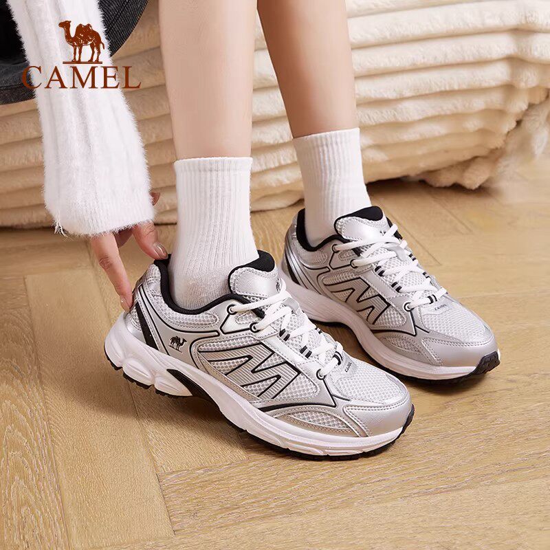 2026春新款骆驼女款慢跑鞋,复古老爹鞋设计,银色时尚百搭,耐磨网面舒适透气,日常休闲运动皆宜