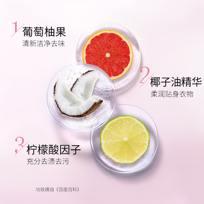 淡淡的清新香气,去味净味!添加阴离子表面活性剂,离子渗入!针对各类分泌物、残留物、血渍、尿渍靶向清洁!轻松去渍搓洗不费力,低泡易漂衣净无忧!