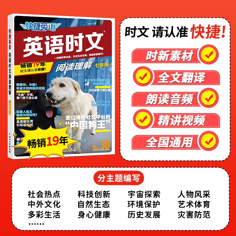 配朗读音频,精讲视频课。连续出版15年时文请认准快捷适用于各版本教材,阅读题源揭秘:阅读文章倾向取材于外刊、外网或是国内权威英文网站及报刊,即所谓“时文”,保证语言地道、语料真实。