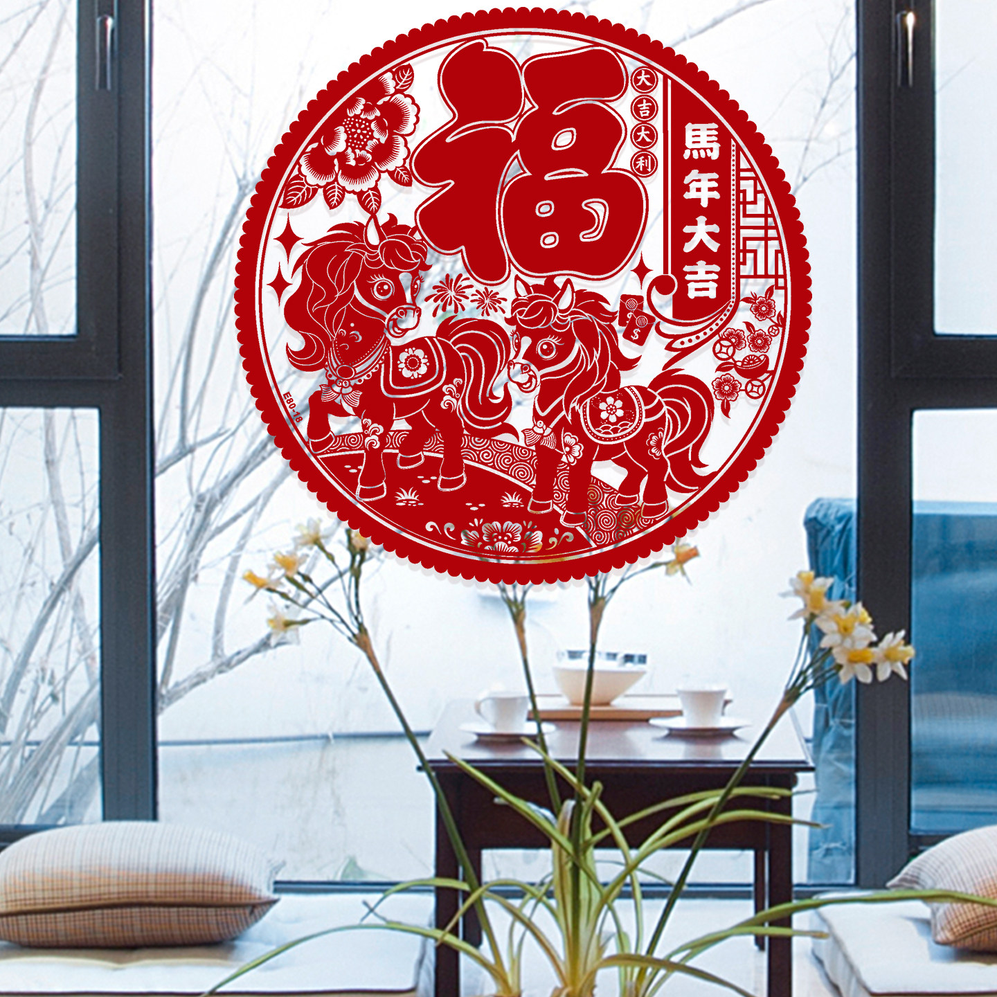 马年窗花新年装饰静电贴植绒过年福字门贴2026新款剪纸春节窗贴纸