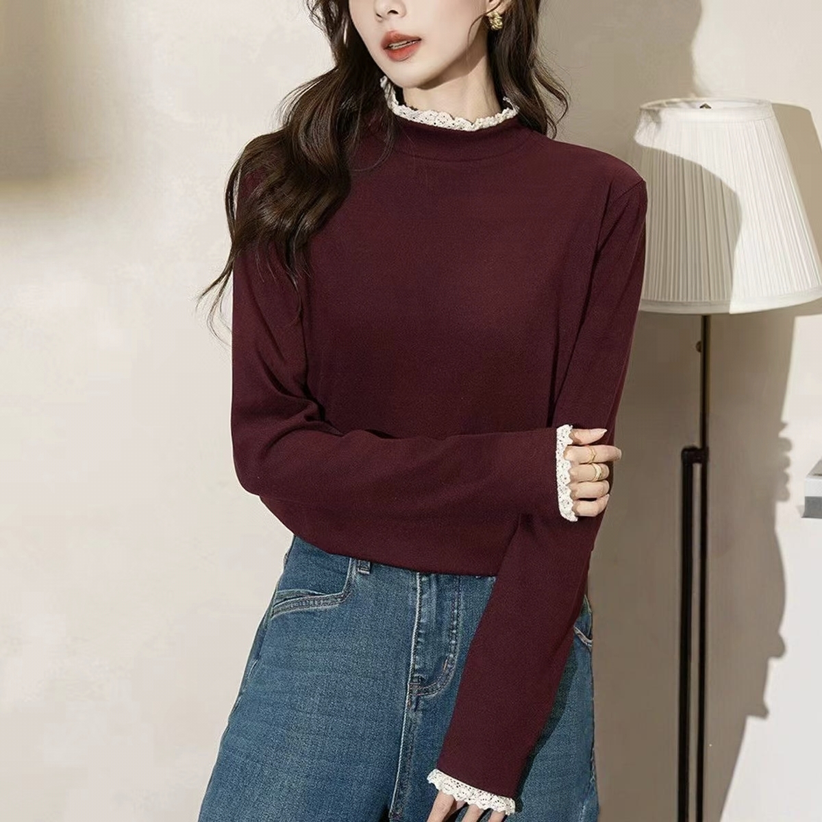 花边拼接半高领打底衫女秋冬双面磨毛修身设计感针织衫内搭ak
