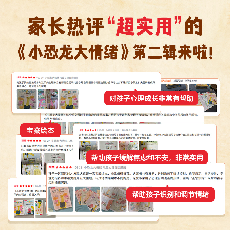 【21.9/5本】专为2-6岁儿童设计的情绪启蒙读物,契合幼儿园情绪管理与社交发展需求。本套漫画书以可爱小恐龙为主角,用生动画面和简明对话帮助孩子识别、理解与接纳常见情绪,如生气、害怕、难过等,降低情绪内耗感;每册主题清晰,语言适龄,配合亲子共读引导提示,助力家长自然开展情绪早教。