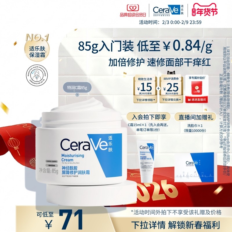 入会赠:C霜15g,先拍0.01权益再买正装加赠:C乳30ml;张凌赫同款CeraVe适乐肤秋冬补水保湿滋润面霜修护!拍85g,叠金币4.26+消费券160-20到手57左右拍454叠金币4.26+消费券160-20到手132