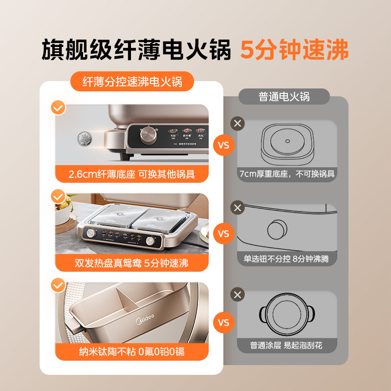 美的超薄速沸电火锅电锅家用分体式分控鸳鸯锅多功能锅火锅专用锅