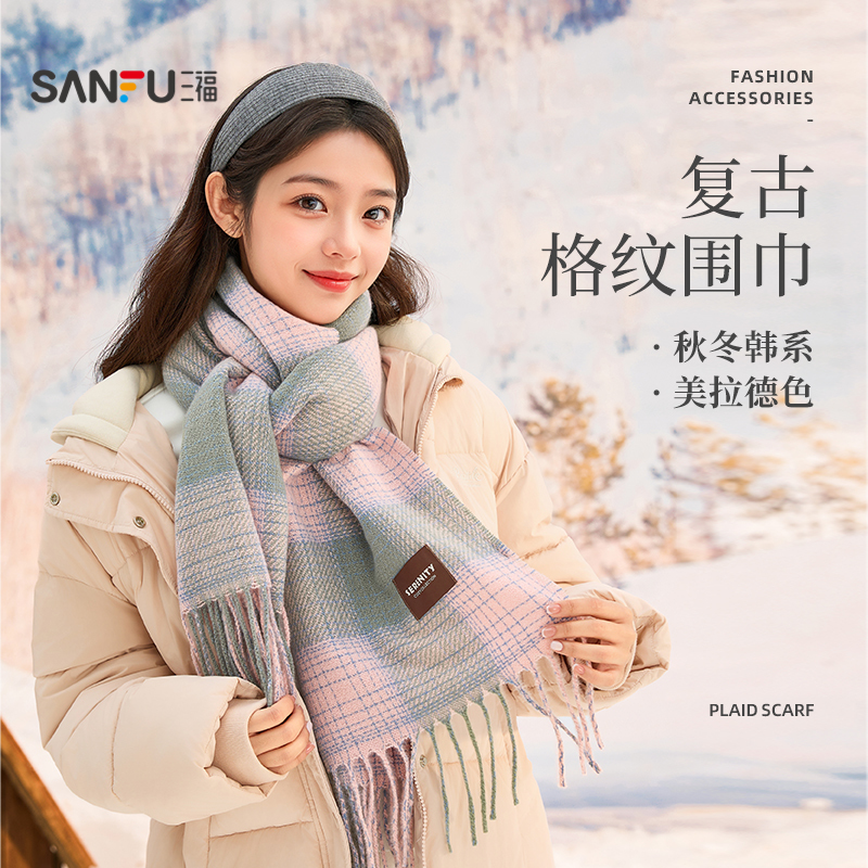 三福格子围巾韩系高级感保暖围脖披肩两用旅游外搭女冬季2025新款!