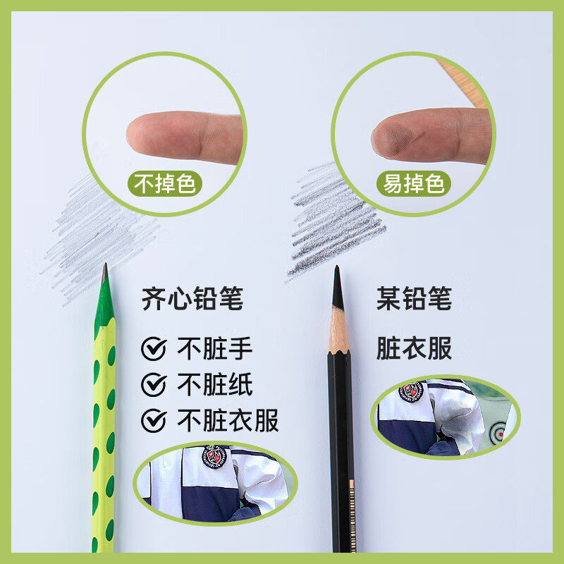 圆孔状凹槽设计,掌握正确执笔姿势,三角笔杆,不易滚动跌落精选木材,紧密贴合保护铅芯搭配橡皮,便于高效擦除安全无铅毒,上市公司品质保证