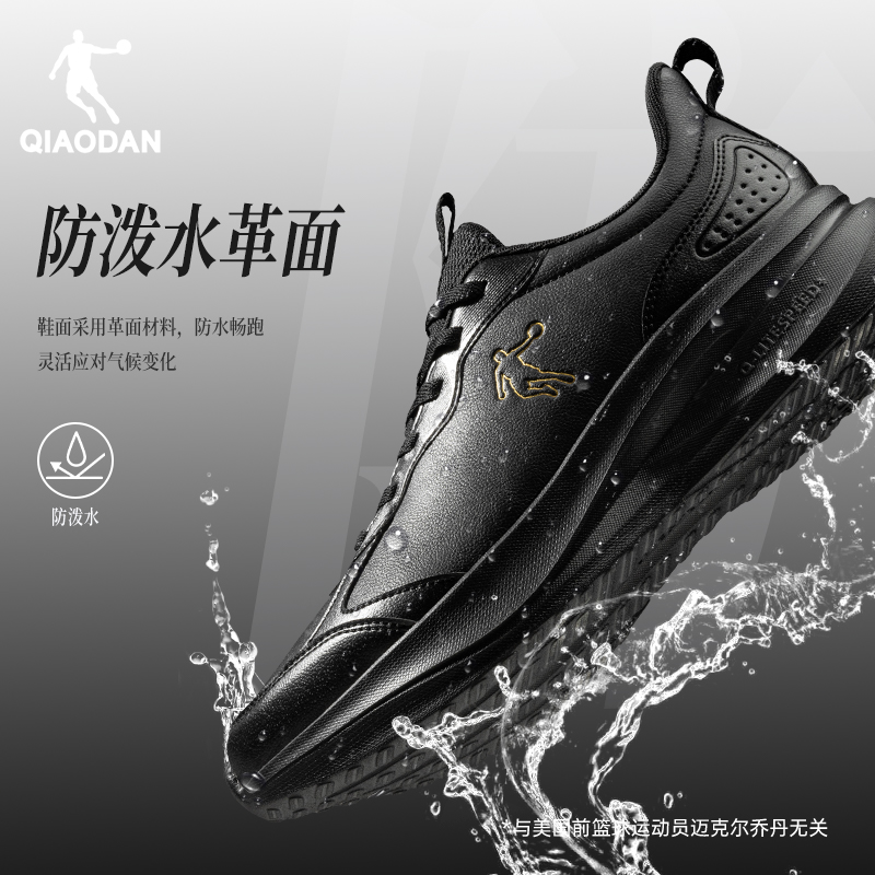 乔丹皮面加绒防水冬季运动鞋男鞋跑步鞋轻便软底减震休闲黑色跑鞋