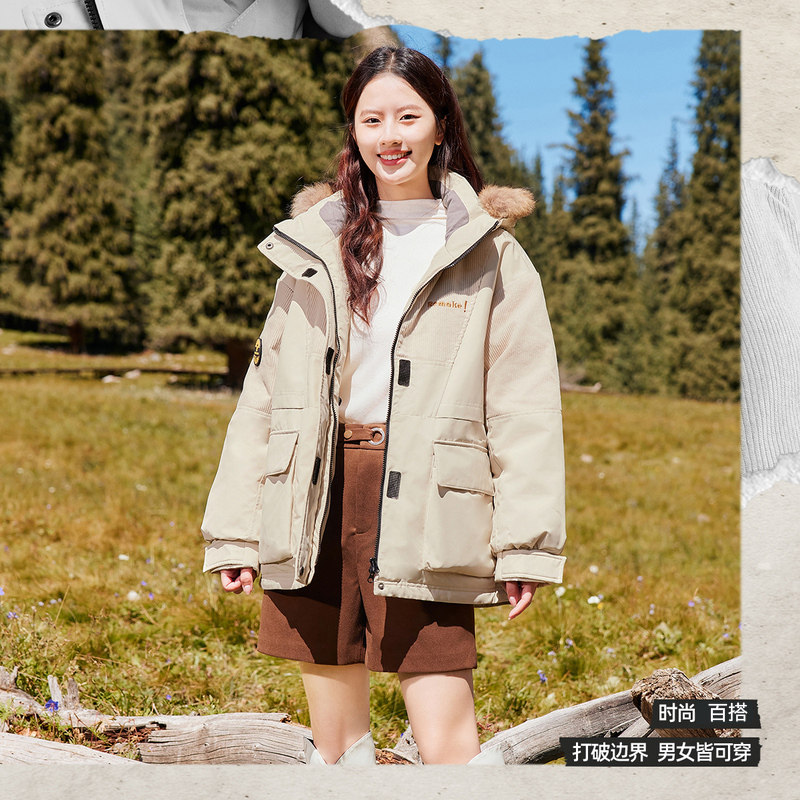 雪中飞秋冬学生潮流校园情侣男女短款貉子毛领羽绒服灯芯绒外套