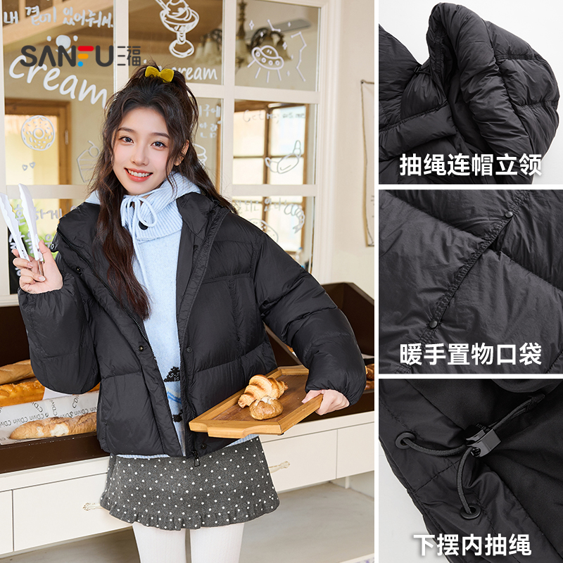 三福羽绒服女款冬季2025休闲短款抽绳摆连帽泡芙外套女装844714