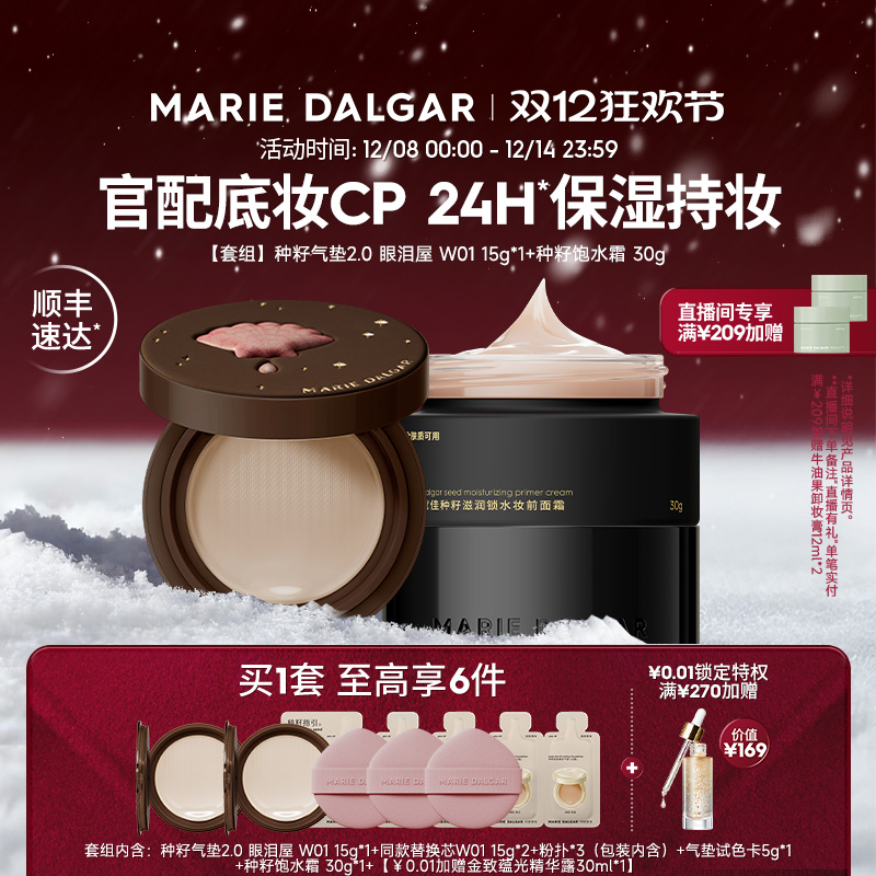 【下单立减80!淘金币再减6到手173!用160-20消费券到手153!】【赠同色号替换芯15g*2+粉扑*3+种籽气垫试色卡5g*1】玛丽黛佳爆款系列!种籽气垫干皮混干适用,持久锁色!滋润细腻服帖!不易拔干,12H保湿贴肤锁妆奶油肌妆效。