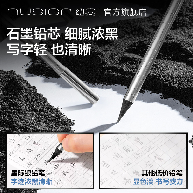 Nusign纽赛星际银圆杆黑木铅笔小学生专用一二年级含笔帽无铅毒高颜值小银杆2bHB考试幼儿园写字练字绘画安全